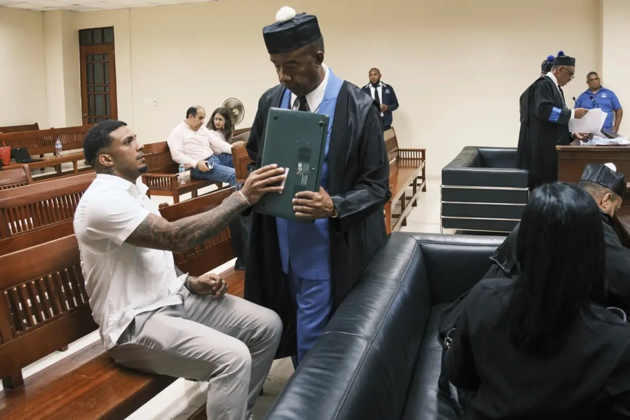 El campocorto de los Rays de Tampa Bay, Wander Franco, habla con su abogado Teodosio Juez durante su juicio por cargos de abusar sexualmente de un menor, en Puerto Plata, República Dominicana, lunes 2 de junio de 2025. (AP Photo/Ricardo Hernandez)