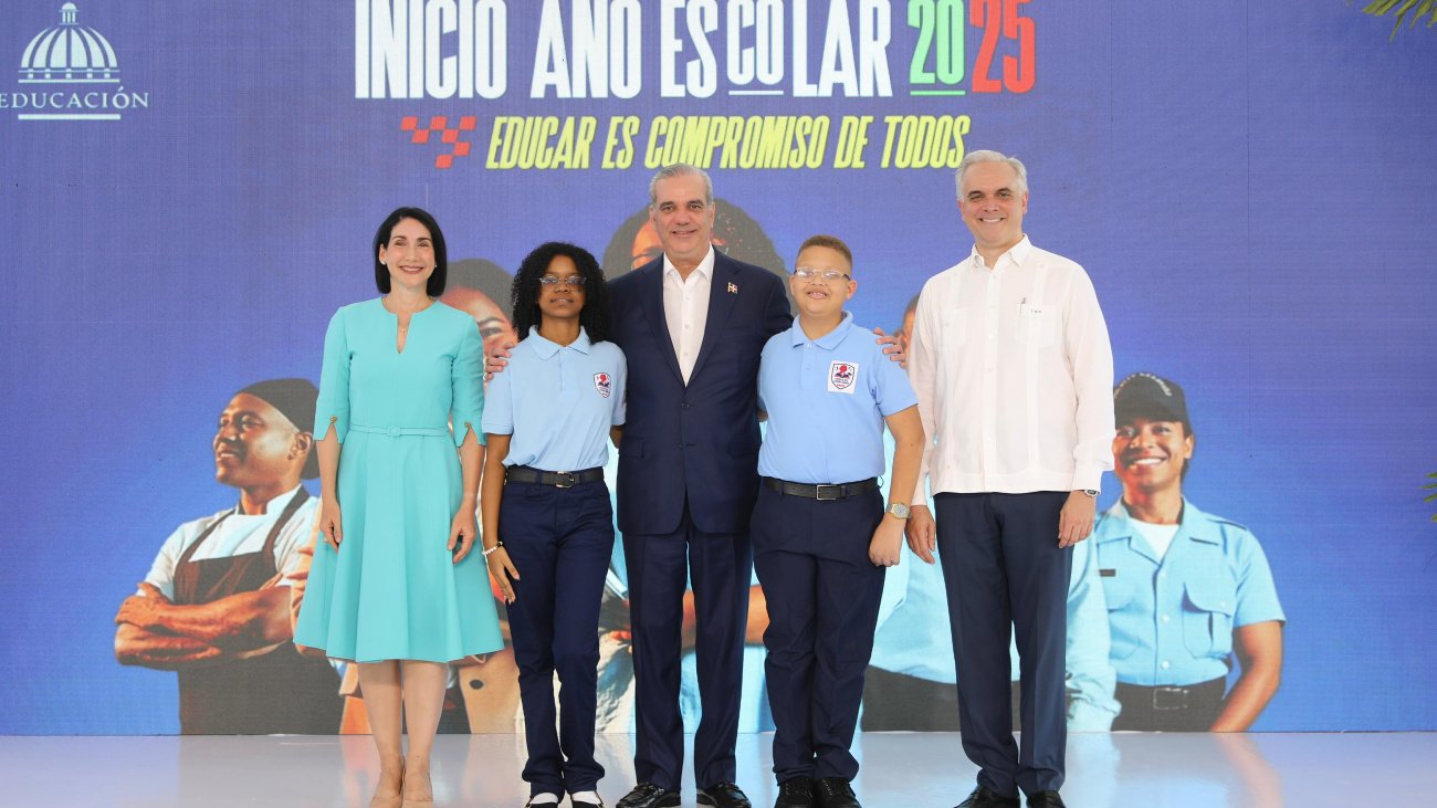 Durante su discurso, el presidente Luis Abinader, acompañado de la primera dama Raquel Arbaje, transmitió un mensaje de esperanza y compromiso al dar inicio al año escolar 2025-2026 e hizo un llamado a los padres para que acompañen y motiven a sus hijos en este nuevo ciclo escolar.